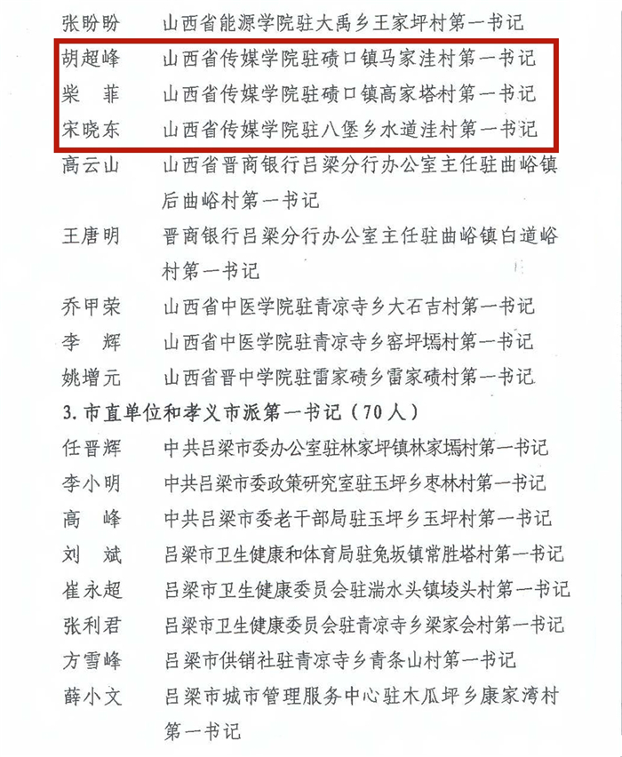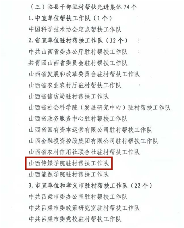 近日收临县县委县政府下发《关于表彰脱贫攻坚工作先进集体和先进个人的决定》。我校驻村帮扶工作队被授予脱贫攻坚先进集体称号,毛鹏杰、宋晓东、柴菲、赵健、胡超峰、薛辉、穆思睿、韩之阳等驻村帮扶干部被授予脱贫攻坚先进工作者称号。