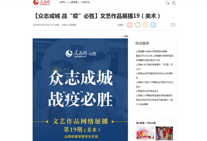为进一步坚定信心、鼓舞斗志,由山西省委网信办、人民日报社山西分社、山西省卫健委、山西省文旅厅、山西省文联联合主办,人民网山西频道承办的“众志成城 战‘疫’必胜”文艺作品征集活动正在开展。活动开展以来,我校师生积极行动,认真组织,充分发挥专业优势,创作了大量作品报送参加。2月12日,人民网对我校部分学生作品进行了展播。此次展播的文艺作品主要由我校文化创意与管理学院学生创作,旨在通过作品来传递温暖,为武汉声援,为中国加油,助力坚决打赢疫情防控阻击战。