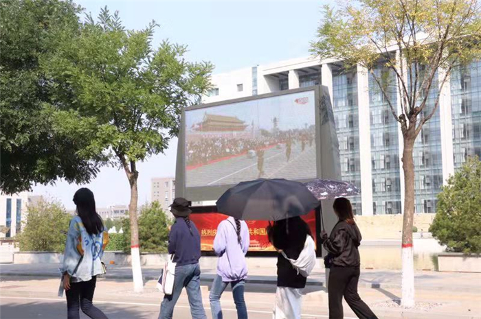 庆祝大会直播期间,校内电子屏也同步播放,同学们纷纷驻足观看。