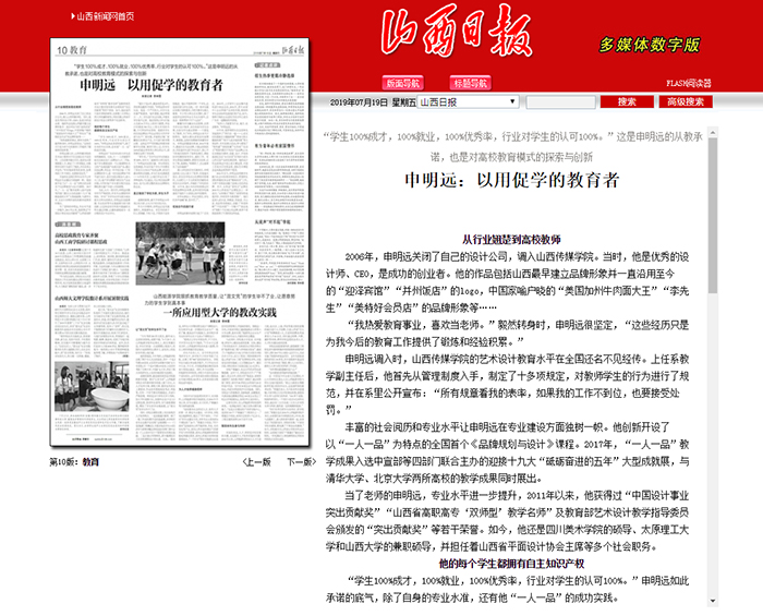 7月18日,《山西日报》(第10版 教育)以《申明远:以用促学的教育者》为题,对我校申明远教授教书育人事迹进行了宣传报道。