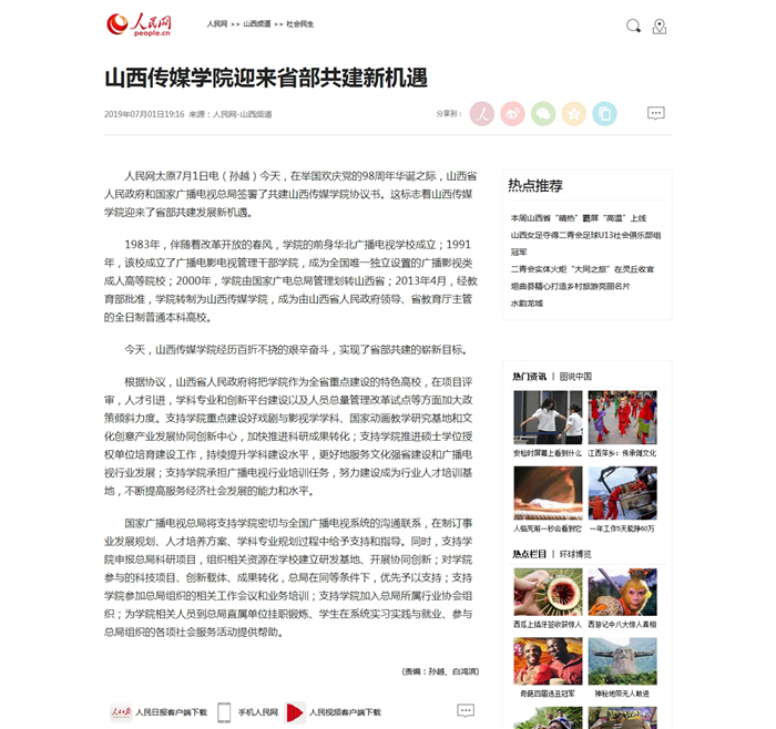 近日,新华网、人民网、《中国教育报》、《山西日报》等多家省内外媒体对山西省人民政府与国家广播电视总局签署共建山西传媒学院协议书进行了宣传报道。7月1日,在举国欢庆党的98周年华诞之际,山西省人民政府和国家广播电视总局签署了共建山西传媒学院协议书。学校将以省部共建为契机,充分利用这次新机遇和新平台,创新现代传媒人才培养模式,不断强化人才培养、科研创作和社会服务能力,为山西经济社会发展和广电行业提供强有力的人才保障和智力支持。