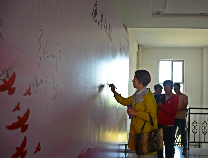 会议结束后,与会校领导带头在印有“廉洁从政 廉洁从教 廉洁从业”的签名墙上签名。