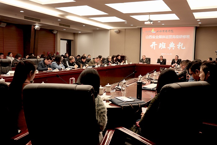 11月21日上午,由省人力资源和社会保障厅主办,省委宣传部协办,我院承办的山西省全媒体运营高级研修班在我院开班。院长王建国,副院长郭卫东出席,来自全省宣传文化系统的媒体、管理者、从业者以及高校教师参加。 郭卫东副院长在致辞中对我院的历史沿革、办校规模、办学理念、科研及教学成果、发展前景以及师资与设备实力作了介绍。他要求研修班成员珍惜学习机会,遵守培训班纪律,按照教学计划的各项要求认真学习,积极交流,顺利完成学习任务,学有所获。