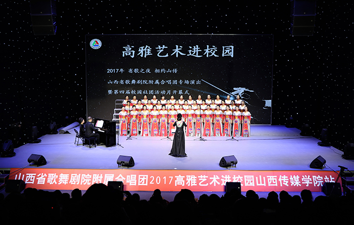 为了丰富校园文化生活,提升学生的艺术素养,11月13日晚,“2017年省歌之夜 相约山传”山西省歌舞剧院附属合唱团专场演出暨第四届校园社团活动月开幕式在我院演播中心600㎡演播厅内举行。党委副书记王俊刚、刘锐出席,团委主要负责人、师生代表参加。