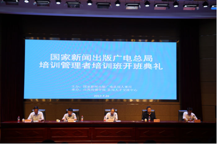为进一步提高广播影视培训管理专业化科学化水平,提高行业内培训管理者队伍的整体素质,7月26日到28日,由国家新闻出版广电总局人事司主办,山西传媒学院和总局人才交流中心承办的国家新闻出版广电总局培训管理者培训班在我校成功举行。在7月26日上午的开班典礼上,国家新闻出版广电总局人事司教育培训一处魏开鹏处长、山西省新闻出版广电局田奇越副局长、山西传媒学院党委书记张汉静教授、山西传媒学院校长王建国教授、副校长郭卫东教授出席。田奇越副局长和王建国校长分别致欢迎辞,魏开鹏处长为学员们上了《新闻出版广电教育培训形势与任务》的培训班第一课。课后,领导、授课教师和学员们饶有兴致地参观了广播影视认知实验室、“品牌良方”展室和演播中心。