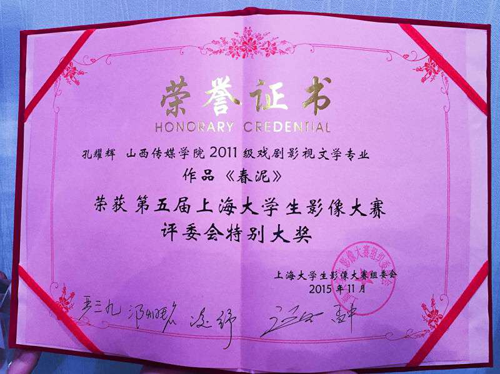 11月1日,第五届上海大学生影像大赛颁奖典礼在上海师范大学举办。我院制作系教师冯思婧指导,2015届电视摄像专业学生孔耀辉导演的短片《春泥》荣获本次大赛评委会特别大奖。