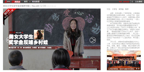 3月13日,山西新闻网主页“视觉志”栏,以“美女大学生奖学金反哺乡村娃”为题报道了我院播音主持系播音与主持艺术专业2013级学生徐聪用奖学金资助吉县吉昌镇兰村中心小学学生和该校患有脊柱疾病的学生刘欢的典型事迹。