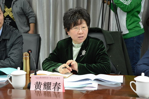 4月13日下午,晋中市委常委、宣传部部长黄耀春带领晋中市文化体制改革和文化产业发展领导组成员单位负责人及文化产业专家来到我院大学生创业基地进行项目调研,并就晋中市榆次区申报的2015年文化产业重点项目进行了整体论证。院长王建国、副院长武升平及相关部门负责人参加了论证会。