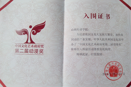 中国文化艺术政府奖动漫奖是为了促进我国文化大发展大繁荣,加快我国动漫产业发展,经扶持动漫产业发展部际联席会议办公室会议研究决定,由文化部、新闻出版广电总局、教育部、工业和信息化部、商务部共同组织成立的。今年3月27日启动第二届动漫奖申报、评选工作以来,经过材料审查、初评评审、终评评审等环节,学院最终入围。据悉全国仅有8所高校获此殊荣。