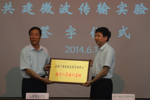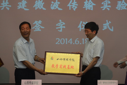 王建国院长简要介绍学院情况,李和林副局长介绍了山西广播电视无线管理中心情况。之后,双方签订《共建微波传输实验室协议书》,并为山西传媒学院教学实践基地和山西省广电局无线管理中心技术人员培训基地授牌。双方还就进一步加强合作和基地建设进行了研讨。