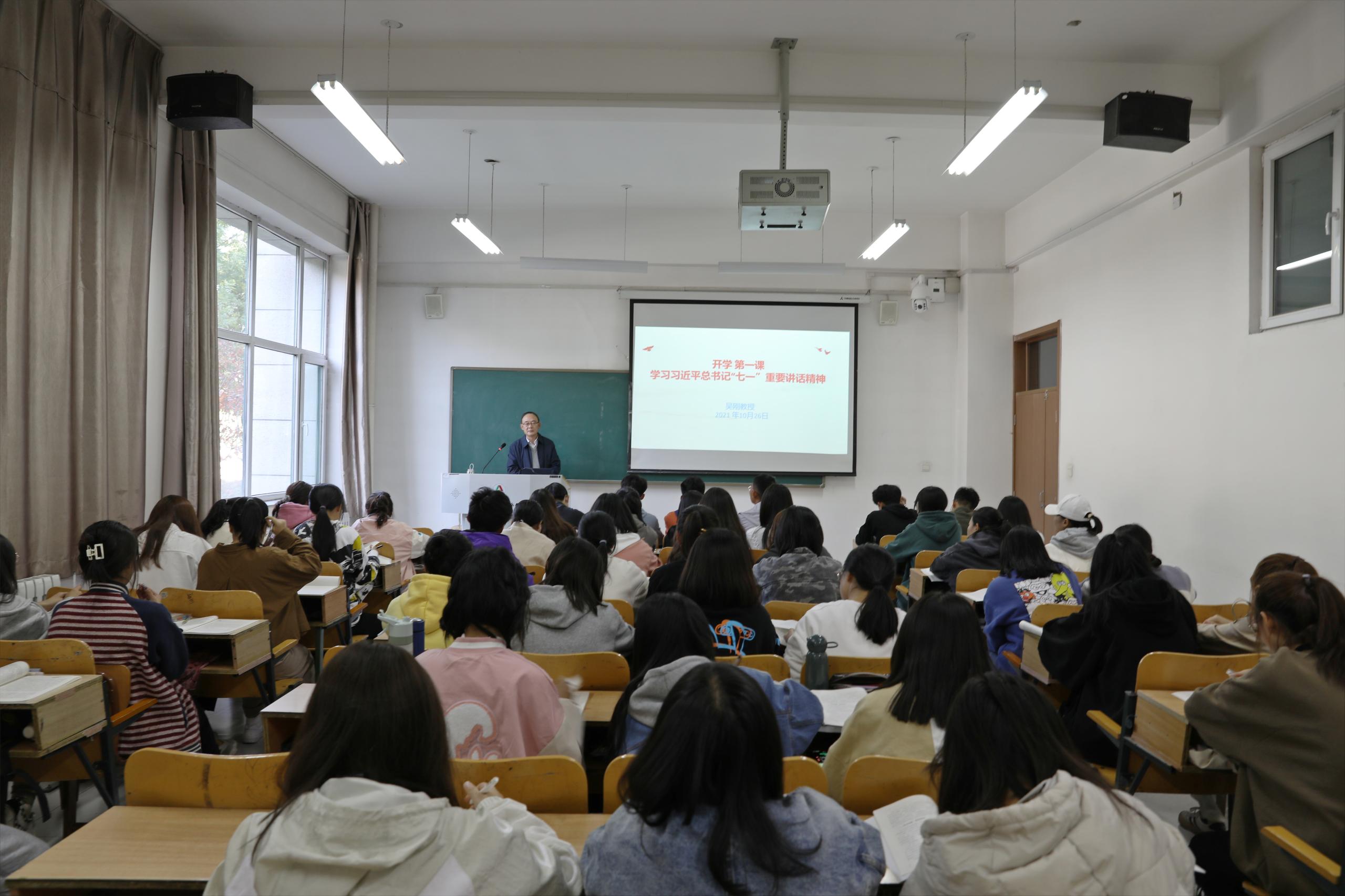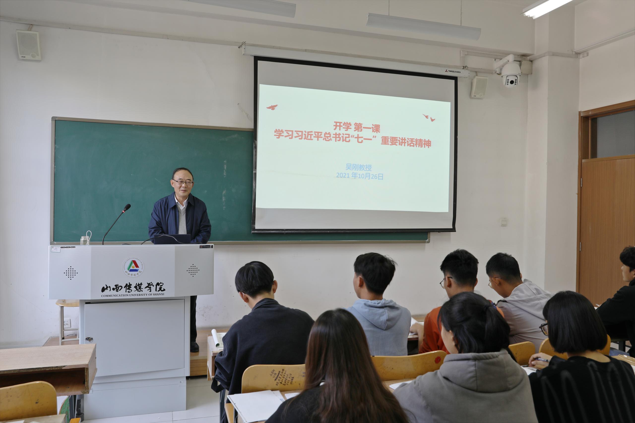 10月26日下午,党委书记吴刚在文博楼B104教室为2021级新生讲授了一堂生动的“形势与政策”课。课程紧紧围绕习近平总书记“七一”重要讲话精神展开。