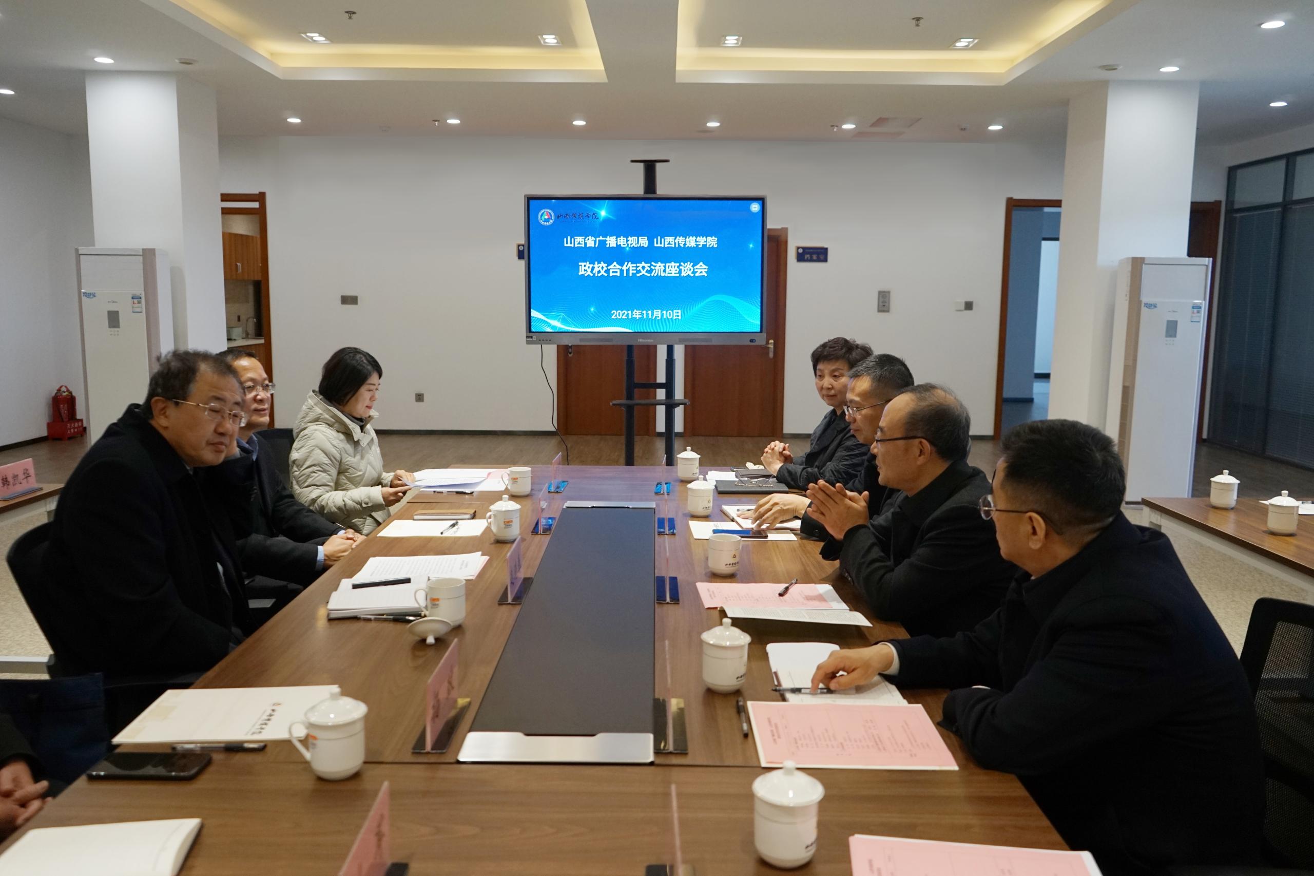 11月10日上午,山西省广播电视局党组书记、局长赵晓春一行8人来我校交流,并就合作事宜进行了洽谈。我校党委书记吴刚,党委副书记、校长李伟,副校长郭卫东、王红叶,办公室主任赵海涛,文化创意与设计研究中心主任王秀萍,太原英可奥笔墨科技有限公司、山西凌云文化发展有限公司相关人员参加座谈会。