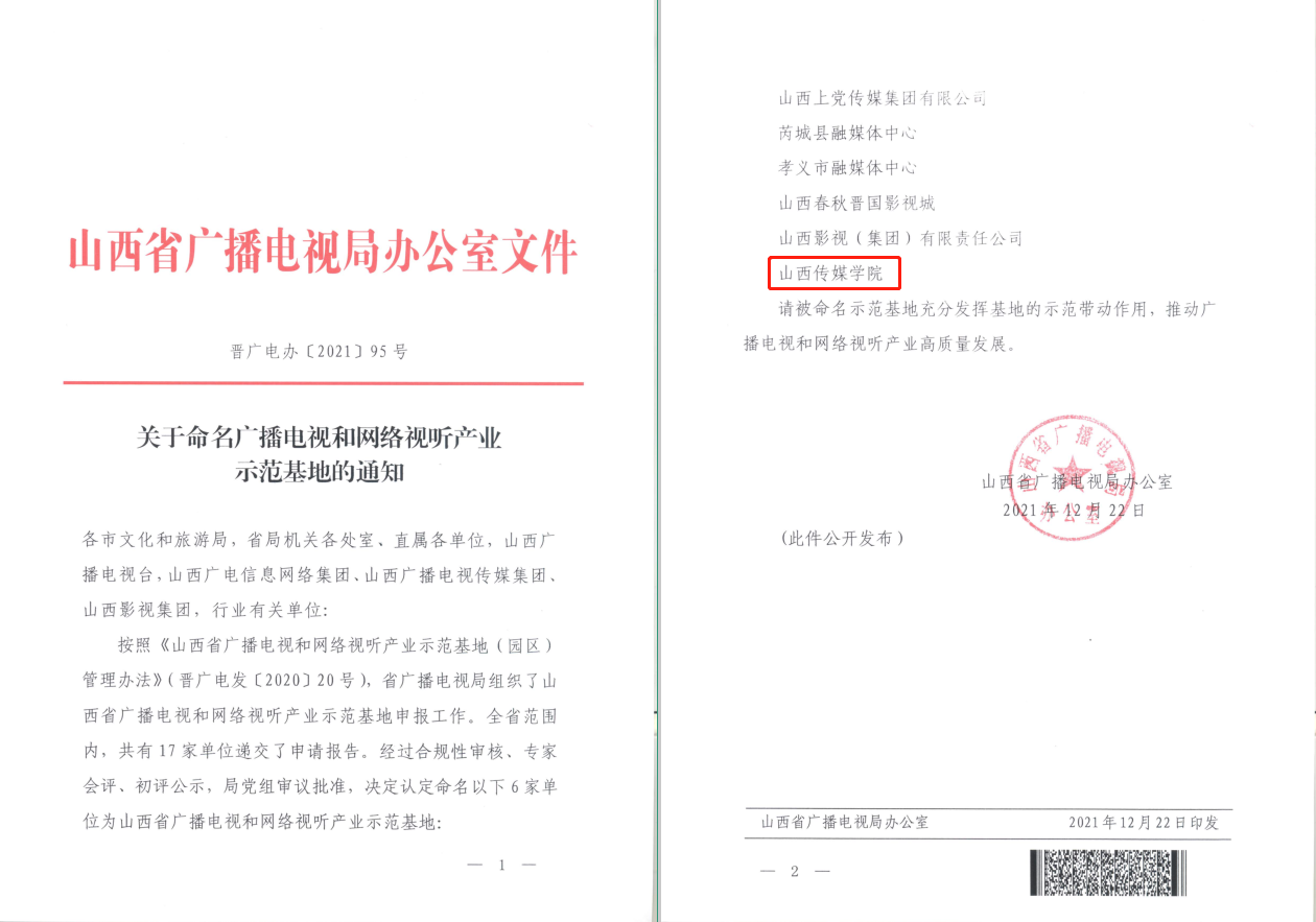 日前,山西省广播电视局办公室发布《关于命名广播电视和网络视听产业示范基地的通知》(晋广电办[2021]95号),经前期申报、专家会评、初评公示、局党组审议批准等程序,我校获批山西省广播电视和网络视听产业示范基地,全省共6家。