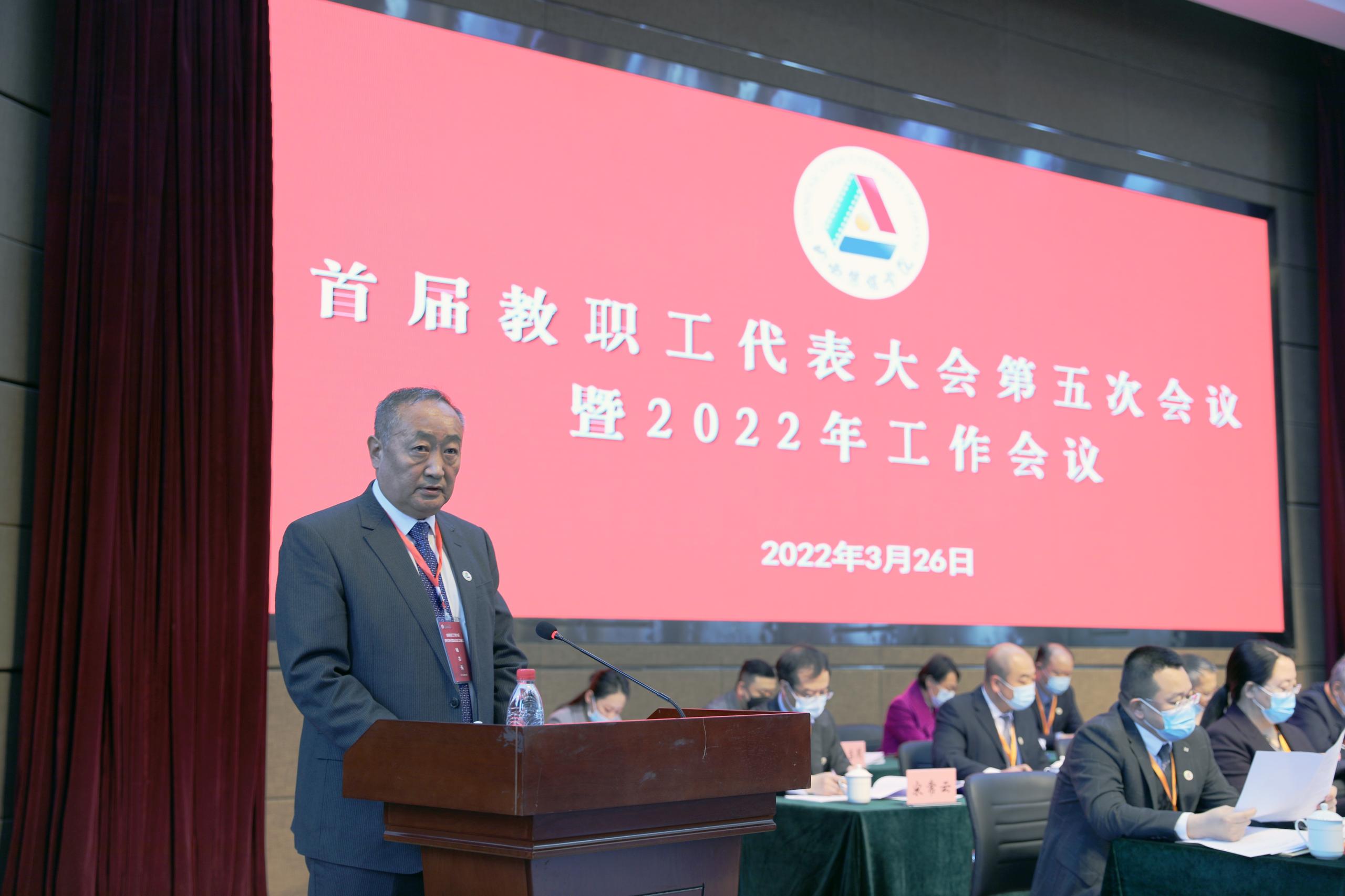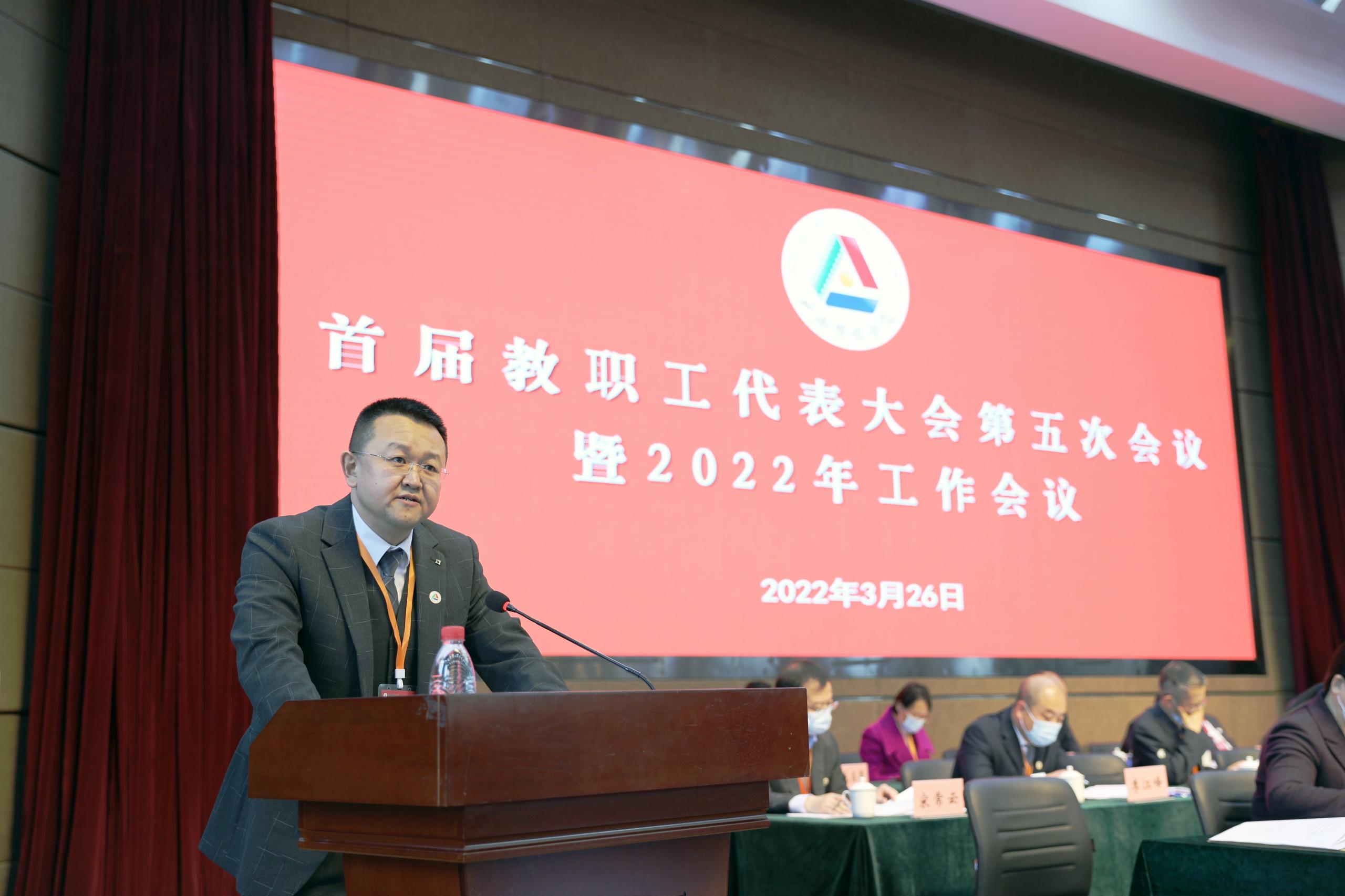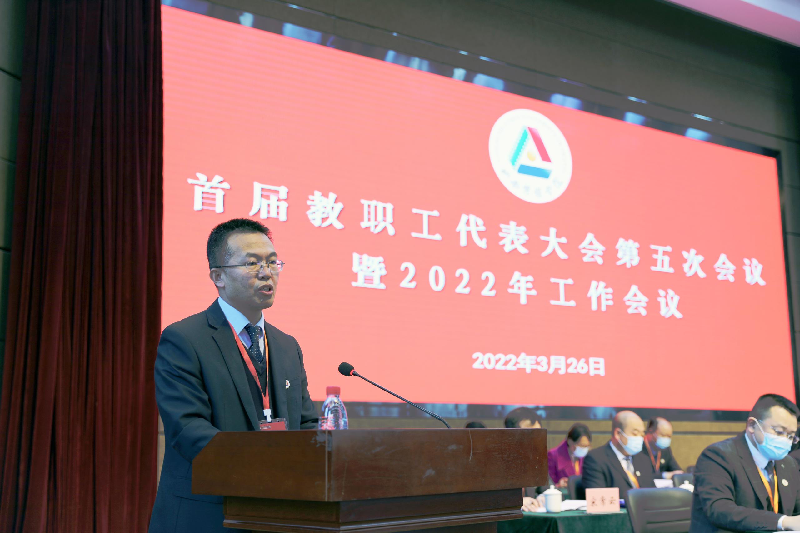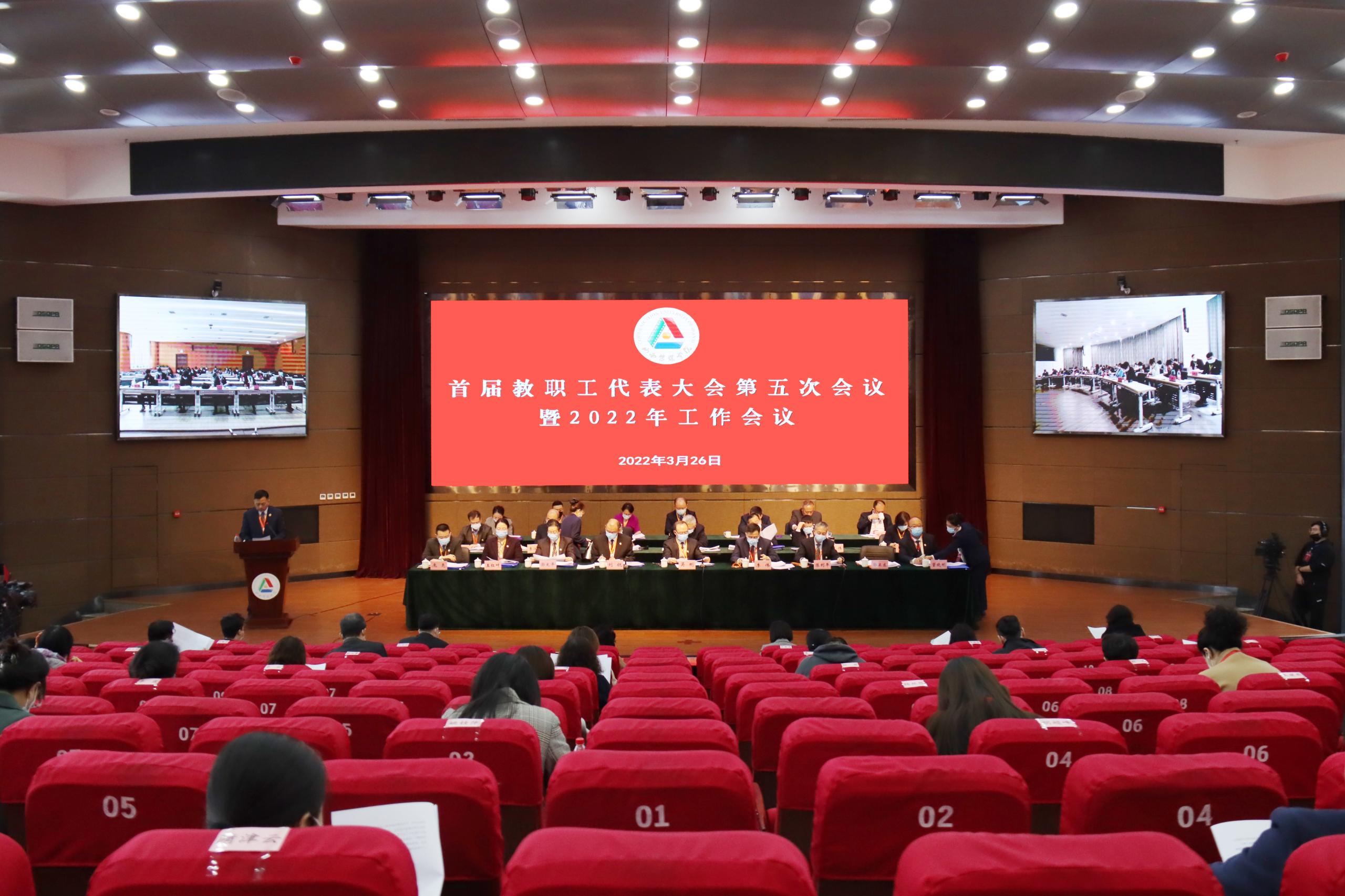 2022年3月26日,我校召开首届教职工代表大会第五次会议暨2022年工作会议。会议以“主会场+2个分会场”视频会议形式在图书馆报告厅召开。全体校领导、教代会代表和不是代表的处级干部、正高级专业技术人员参加会议。