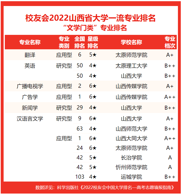 近日,由全国第三方大学评价机构艾瑞深校友会网(Cuaa.Net)独家撰写、科学出版社正式出版发行的《2022校友会中国大学排名—高考志愿填报指南》发布最新校友会2022山西省大学一流专业排名、2022山西省大学各门类一流专业排名。