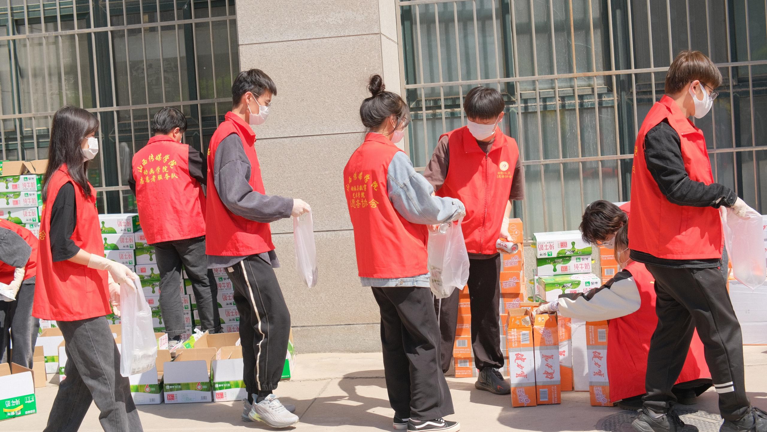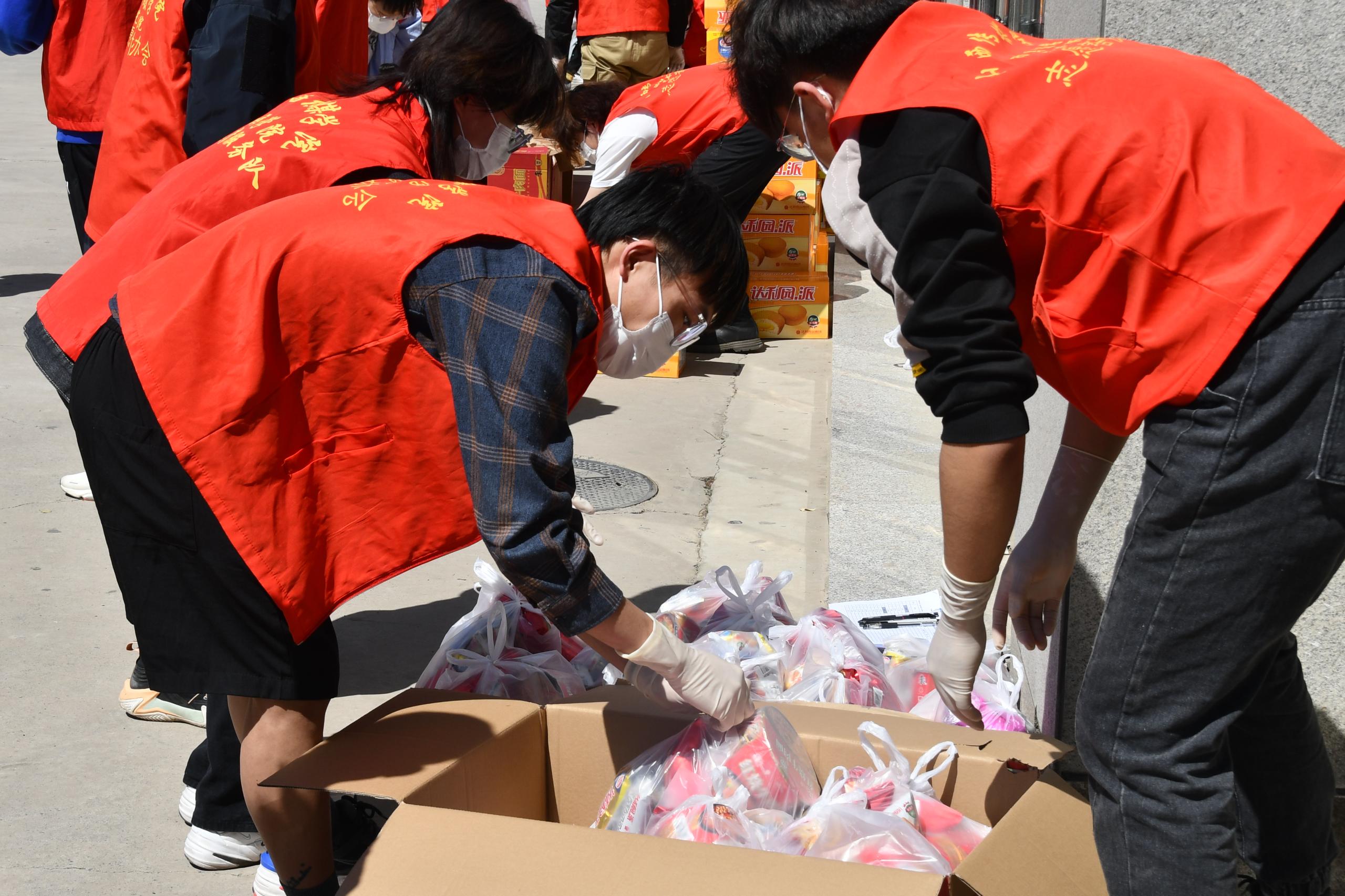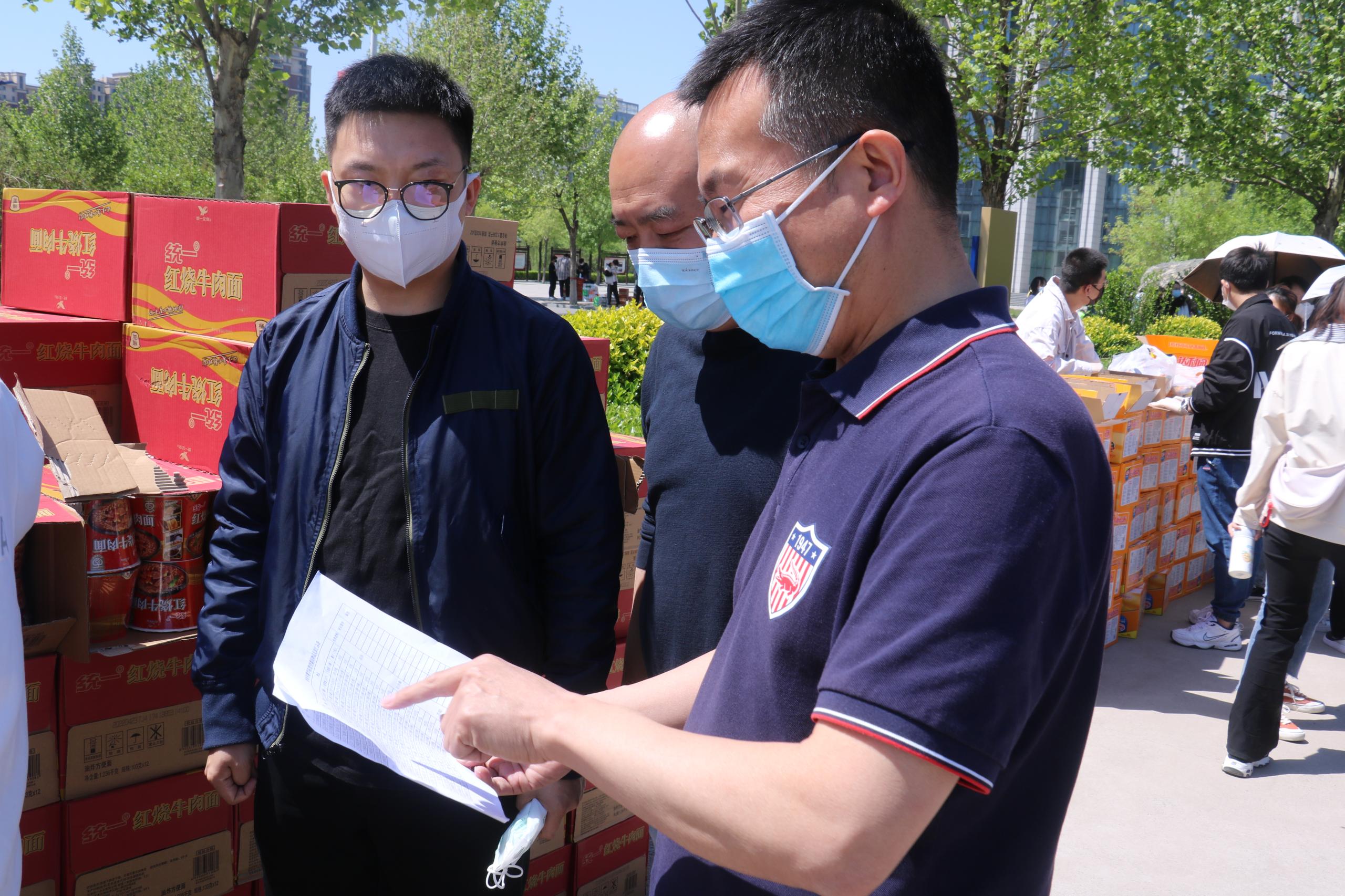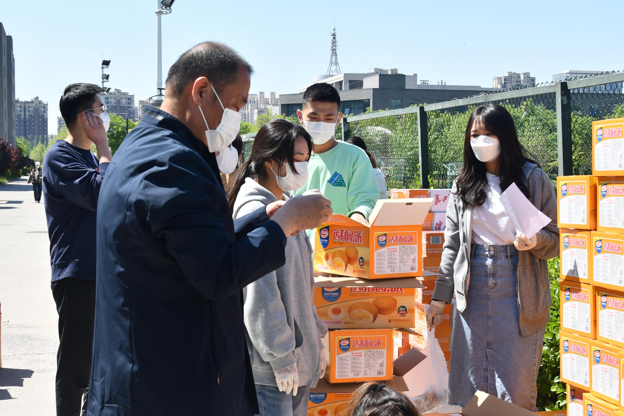 本次发放的暖心礼包包含牛奶、蛋糕、薯片、方便面、健力宝等五种食品,共计11件,涉及七千多名师生员工。为遵守疫情防控要求,减少人员聚集,物资发放分别在体育馆、篮球场、素质拓展中心、食堂前广场、图书馆东广场五个区域按学院分批次进行。物资发放过程中,学生们佩戴口罩,井然有序。