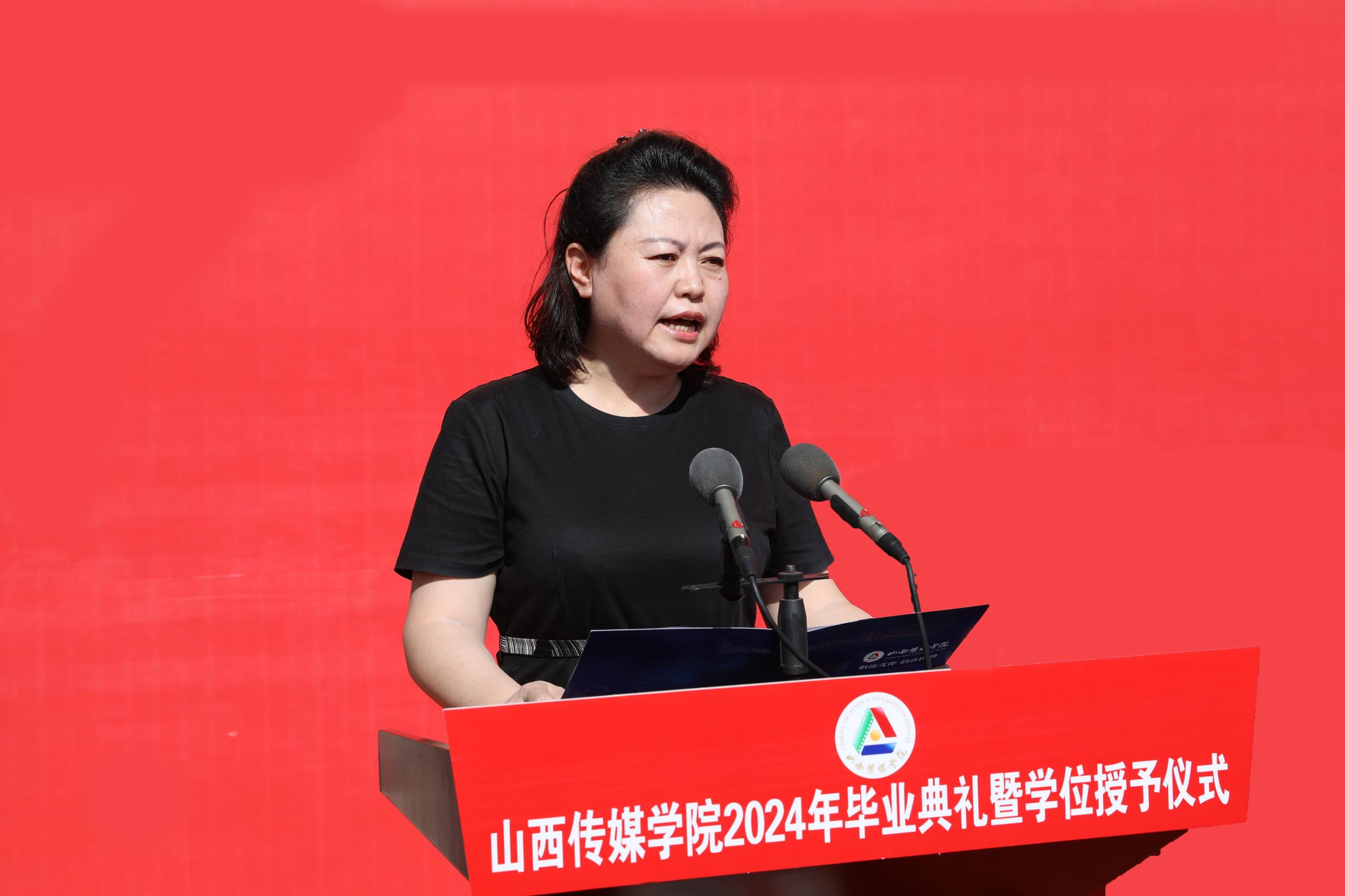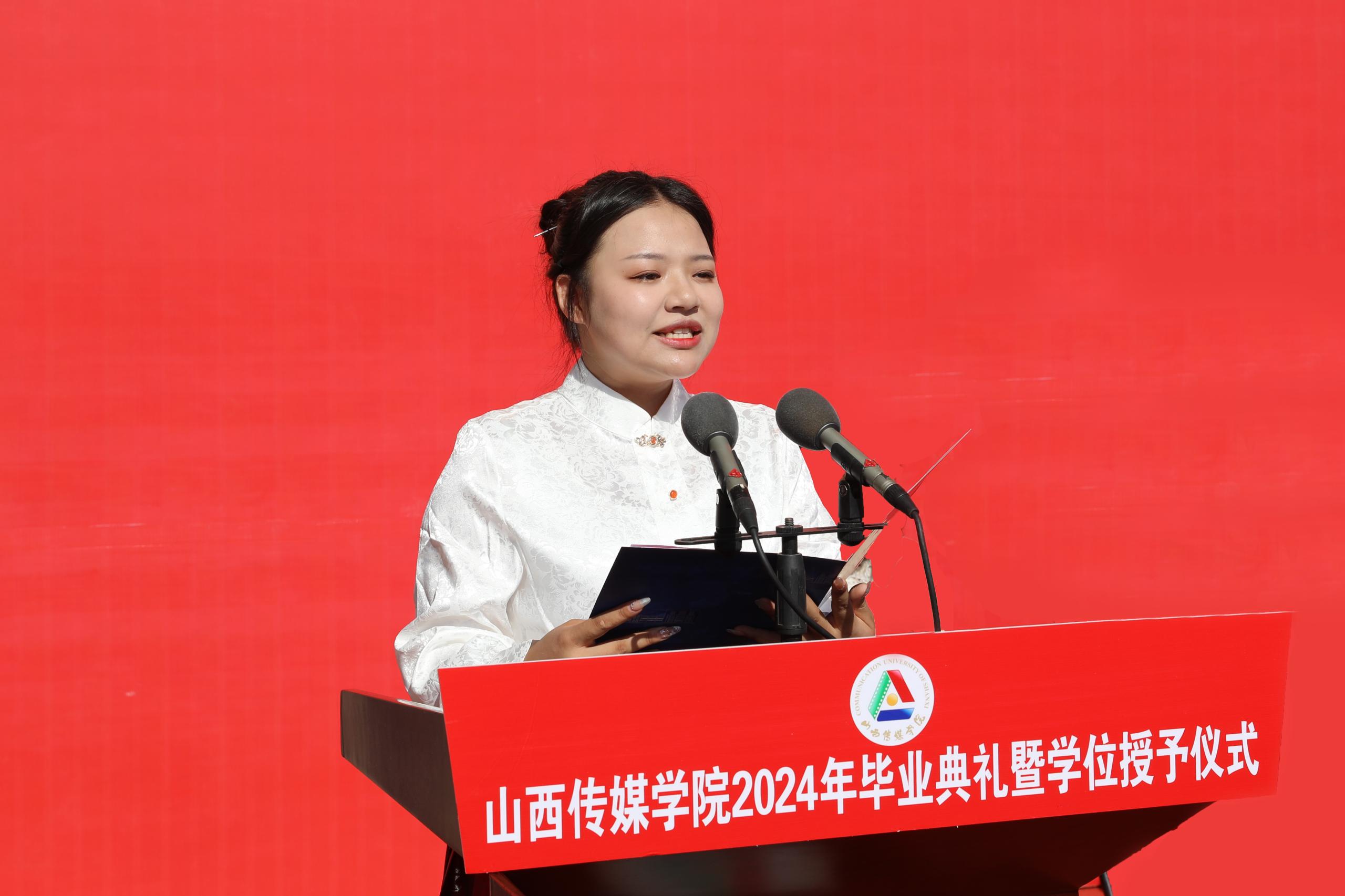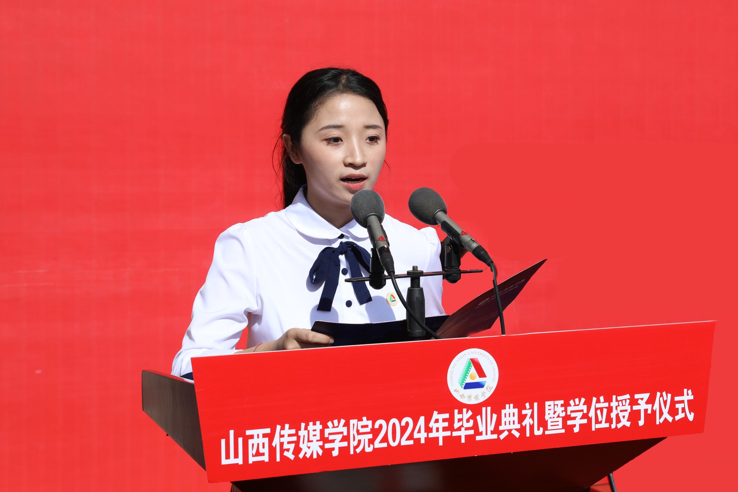 山西电影学院2021级戏剧影视文学专业康娇玉作为在校生代表发言。她代表在校生祝愿学长学姐们带着知识给予的理想与未来,带着实践给予的底气和智慧,昂首阔步,踏上新的征程,去更宽广的天地,谱新的梦想篇章。