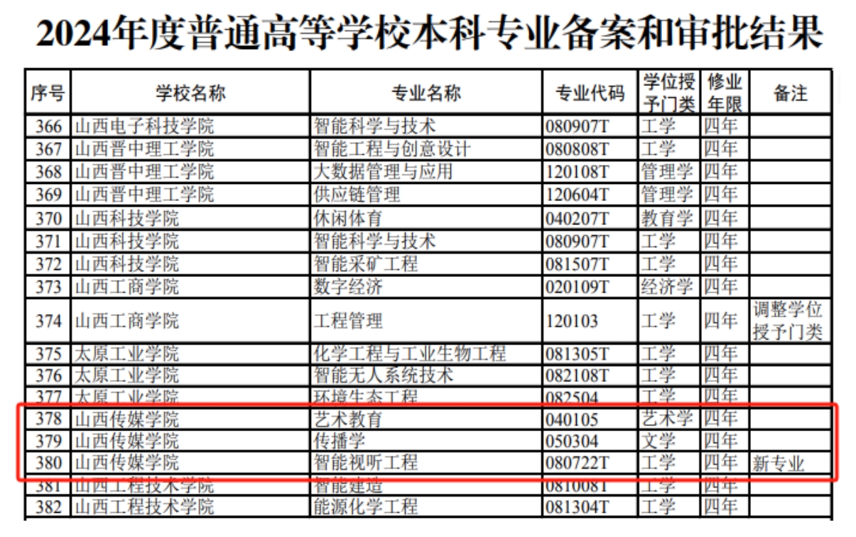 近日,教育部公布了2024年度普通高等学校本科专业备案和审批结果,我校申报的智能视听工程、传播学、艺术教育三个本科专业成功获批,计划于2025年秋季正式招生。此次新增专业是我校对接国家战略需求、服务区域产业发展、优化学科专业结构的重要体现