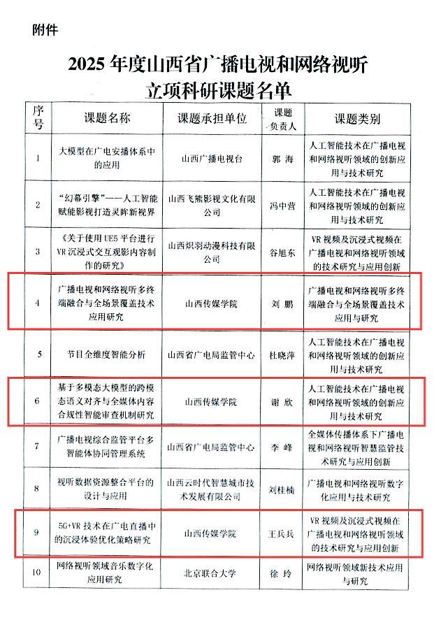 近日,山西省广播电视局公布《关于公布2025年度山西省广播电视和网络视听立项科研课题的通知》,我校共有3项课题立项。