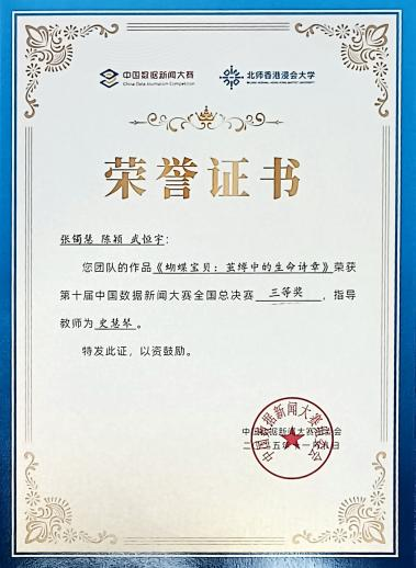 11月8日,第十届中国数据新闻大赛暨首届AIGC应用大赛决赛在珠海北师香港浸会大学落下帷幕。由我校新闻传播学院副教授史慧琴指导,张镯慧、陈颖、武恒宇三位同学共同完成的数据新闻作品《蝴蝶宝贝:茧缚中的生命诗章》从全国1400余组参赛作品中脱颖而出,跻身全国总决赛,最终在300余支决赛队伍中荣获全国三等奖。