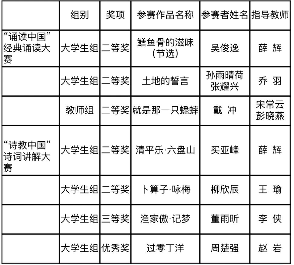 12月3日,由教育部、国家语委举办的第六届中华经典诵写讲大赛各项赛事结果公布。经过前期的积极部署,认真筹划和组织动员,本届比赛我校共选送作品44部,其中“诵读中国”经典诵读大赛省赛选送22部,“诗教中国”诗词讲解大赛省赛选送10部,“笔墨中国”汉字书写大赛省赛选送12部,参与比赛人数再创新高。经过省赛和国赛的比拼,我校最终获得诵读大赛国赛二等奖3项;诗词讲解大赛国赛二等奖2项,三等奖1项,优秀奖1项。学校播音主持学院和人文学院获省赛优秀组织奖,戴冲、王露老师获省赛优秀组织个人奖。