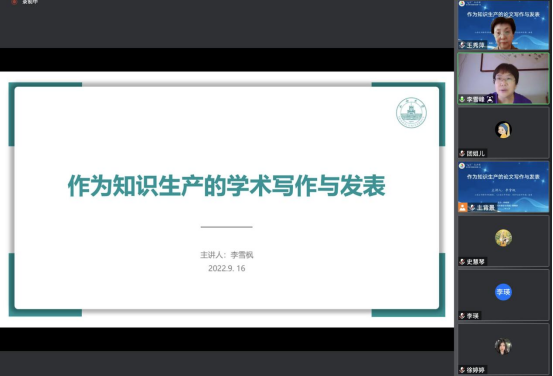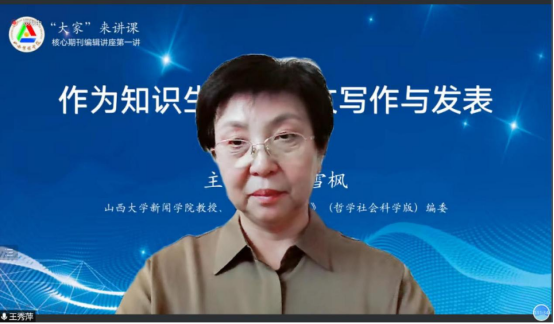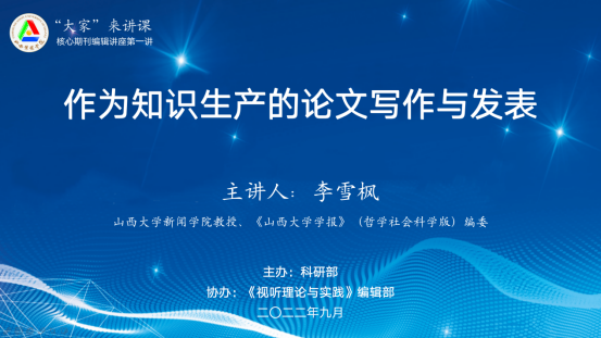 9月16日,山西大学新闻学院教授、《山西大学学报》编委李雪枫教授通过线上视频会议的形式为我校师生作了题为《作为知识生产的论文写作与发表》的讲座。此次讲座是“核心期刊编辑讲座”的第一讲,也拉开了秋季学期“‘大家’来讲课”学术活动的大幕。科研部部长王秀萍主持讲座,120名师生线上共同聆听了讲座。